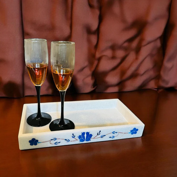 - The Marble Tray is expertly crafted from white marble with elegant inlay on the sides.